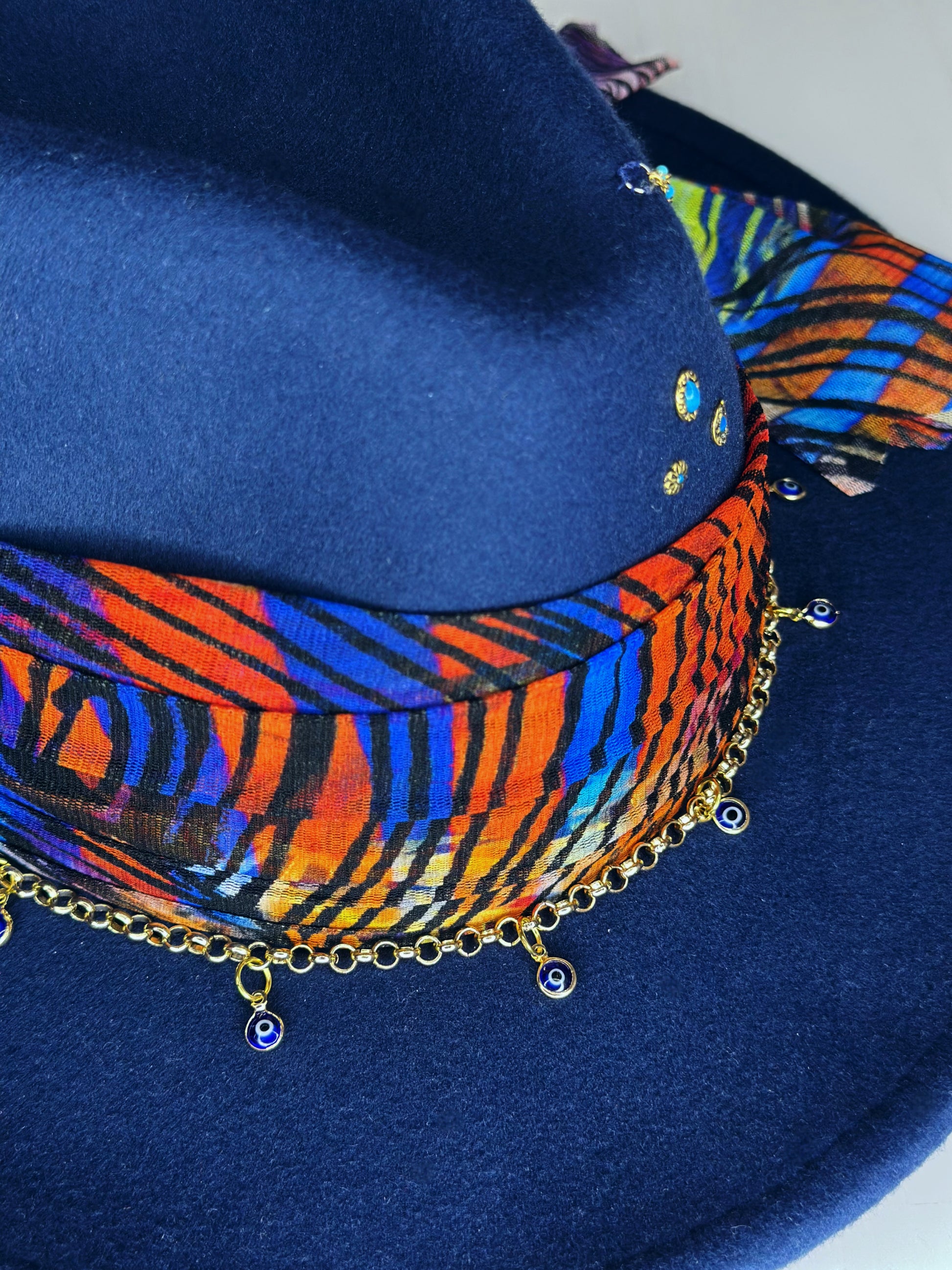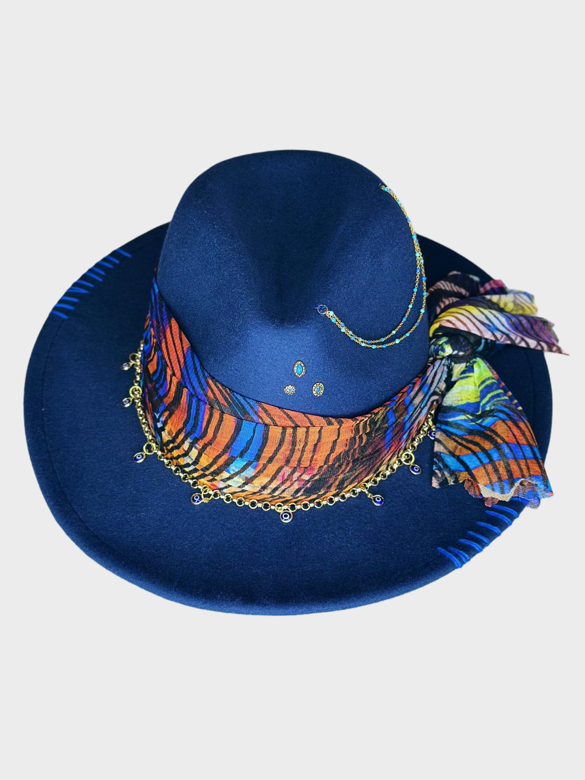 il foulard in viscosa dai motivi etnici, le nappine e i charms in metallo aggiungono un tocco di vivacità e originalità al cappello, mentre le pietre turchesi sottolineando il suo carattere unico dal look boho-chic. La tesa media è larga 7,5 cm., ideale per le giornate all'aperto.