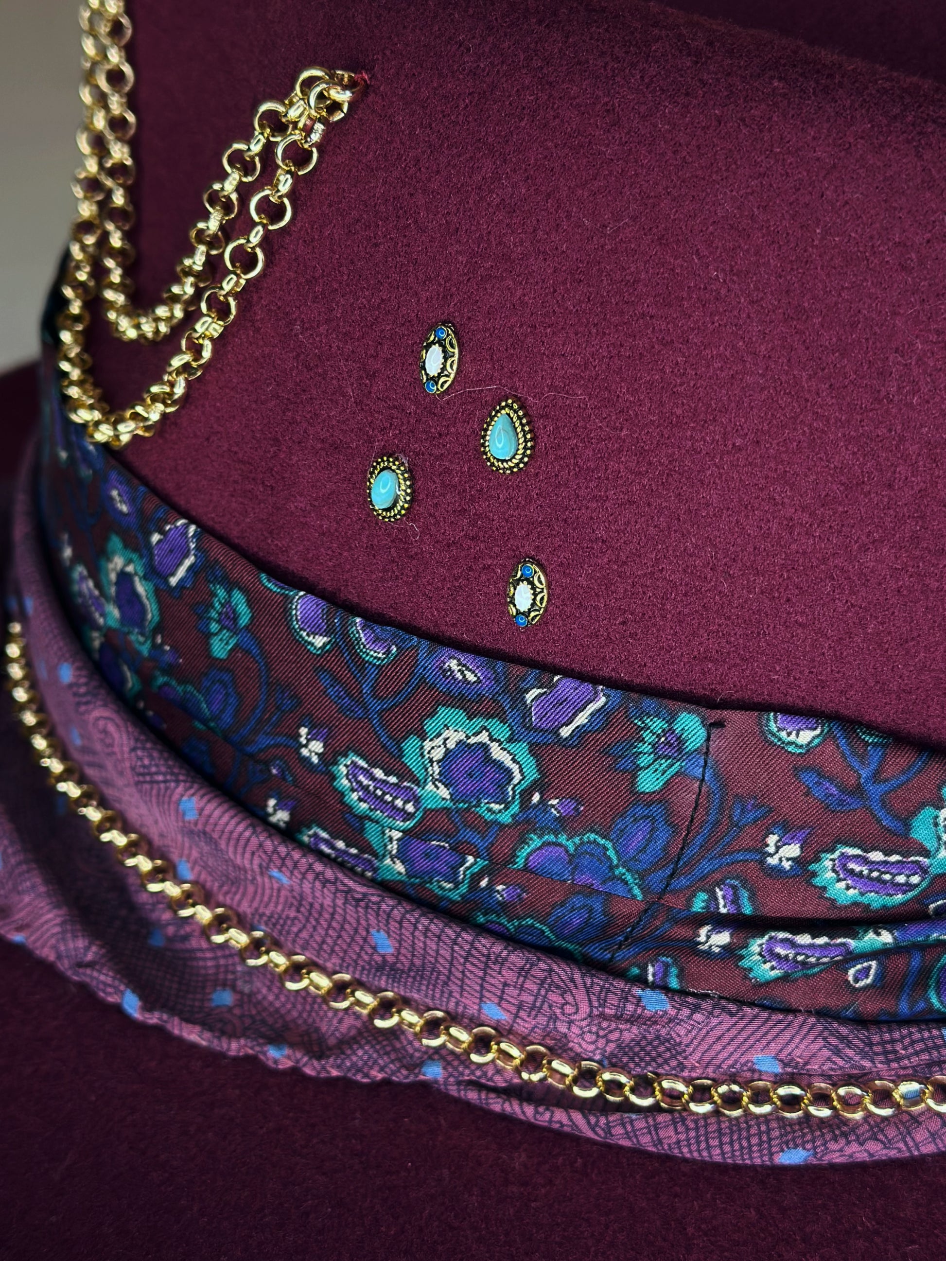 Fedora Hat, è uno dei modelli più classici dal design raffinato grazie alla linea minimalista. Il cappello ha molti dettagli tra cui un foulard in seta annodato che rende dinamico la linea del cappello e 2 foulard in seta dai motivi paisley, le impunture a contrasto e i charms in metallo aggiungono un tocco di vivacità e originalità al cappello dal carattere unico dal look boho-chic. La tesa media è larga 7,5 cm., ideale per le giornate all'aperto.