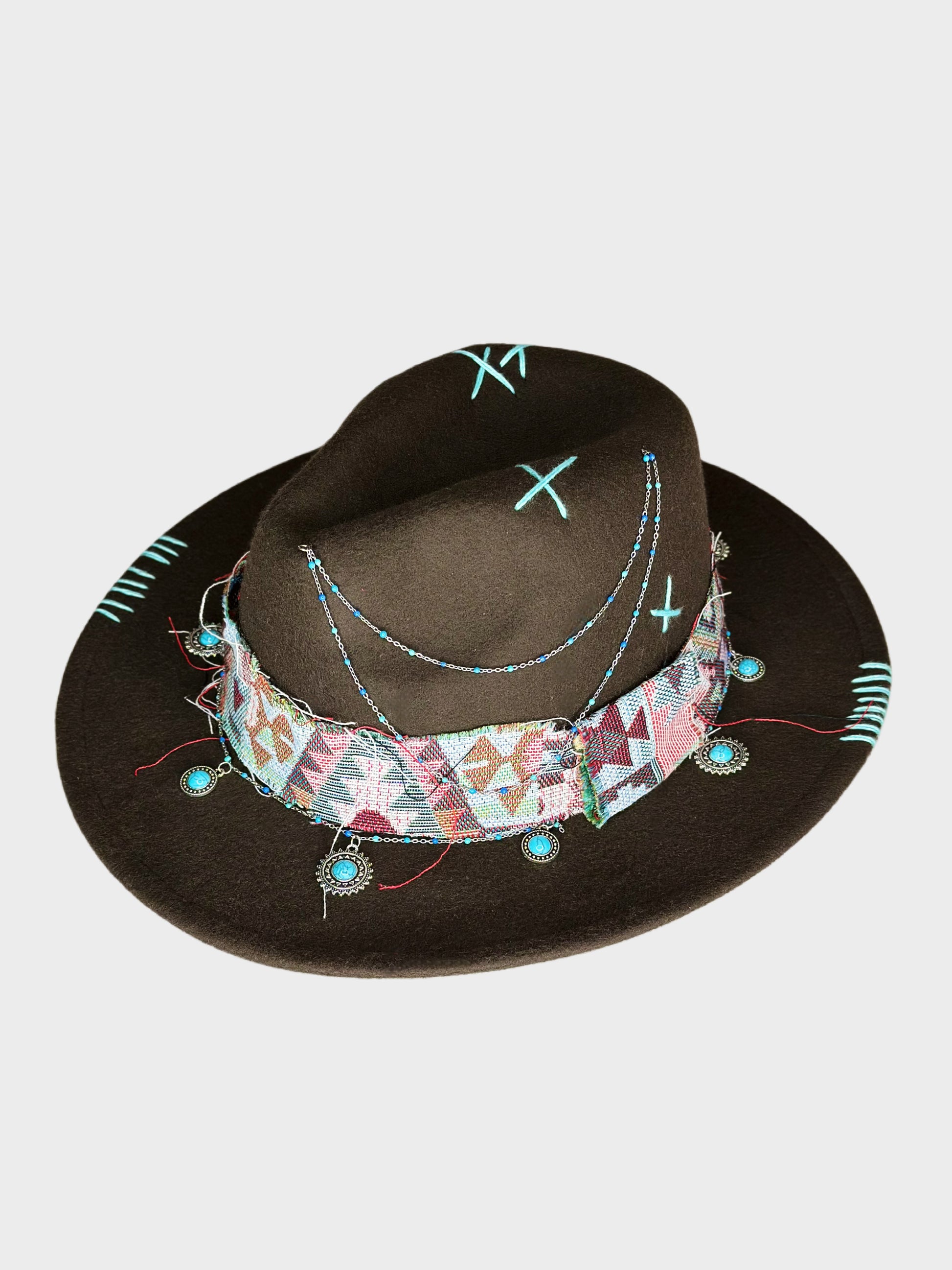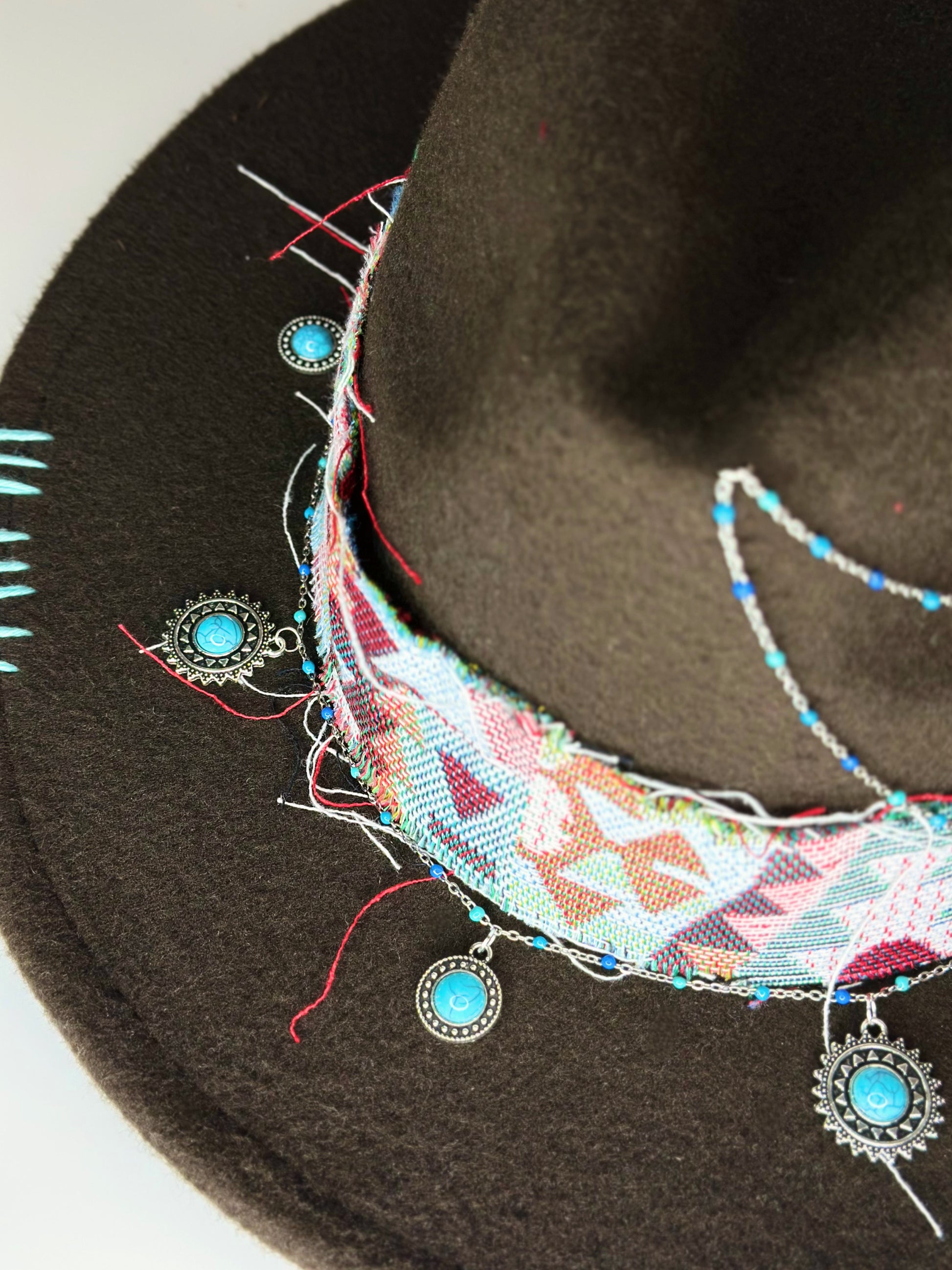 Il decoro in jacquard dai motivi etnici, i ricami fatti a mano e i charms in metallo aggiungono un tocco di vivacità e originalità al cappello, mentre le pietre turchesi sottolineando il suo carattere unico dal look boho-chic. La tesa media è larga 7,5 cm., ideale per le giornate all'aperto.