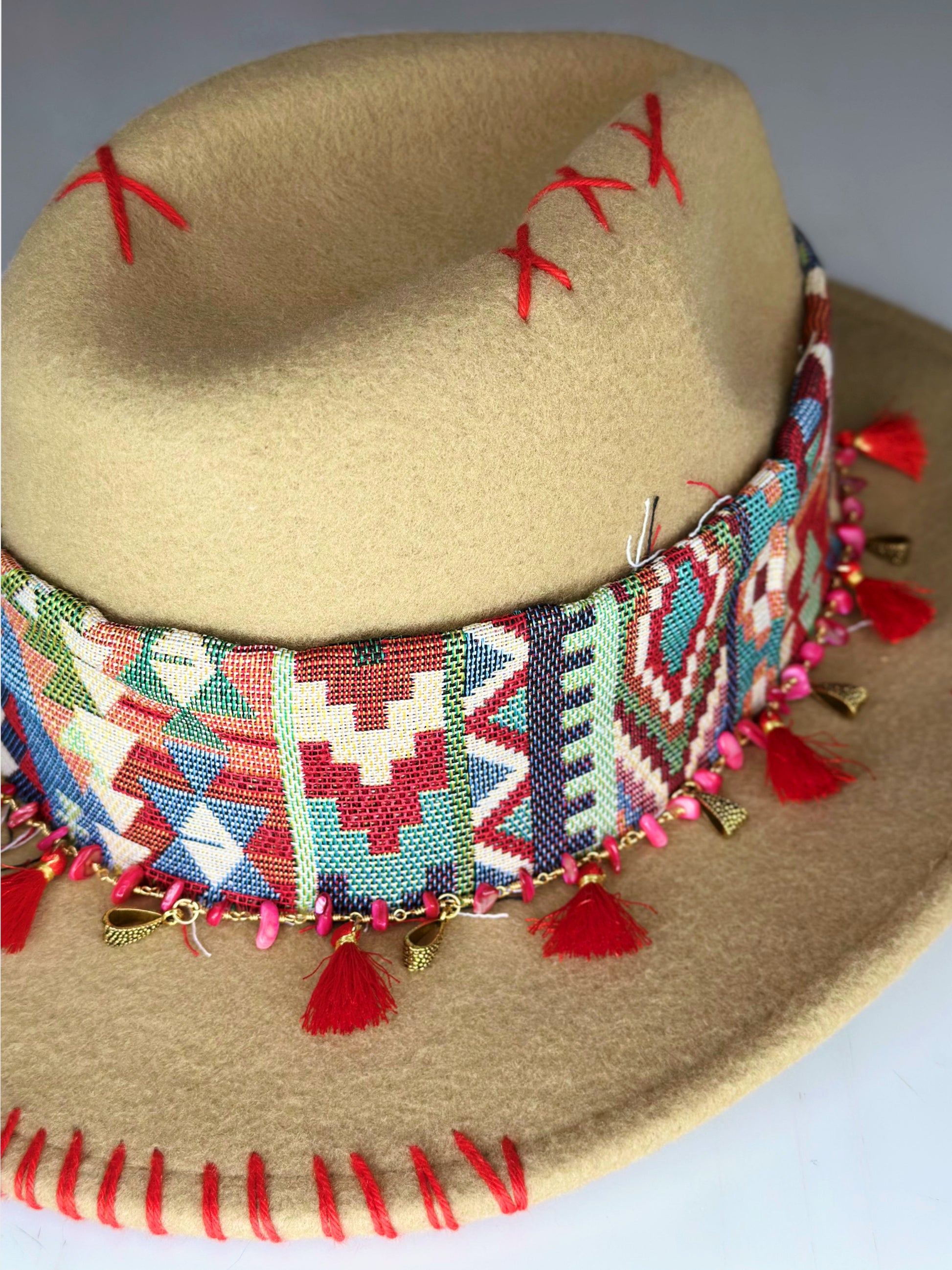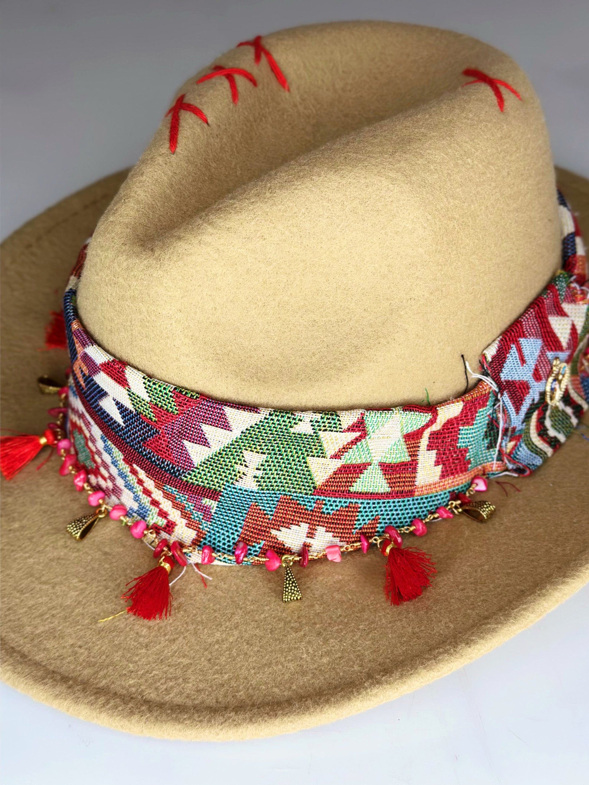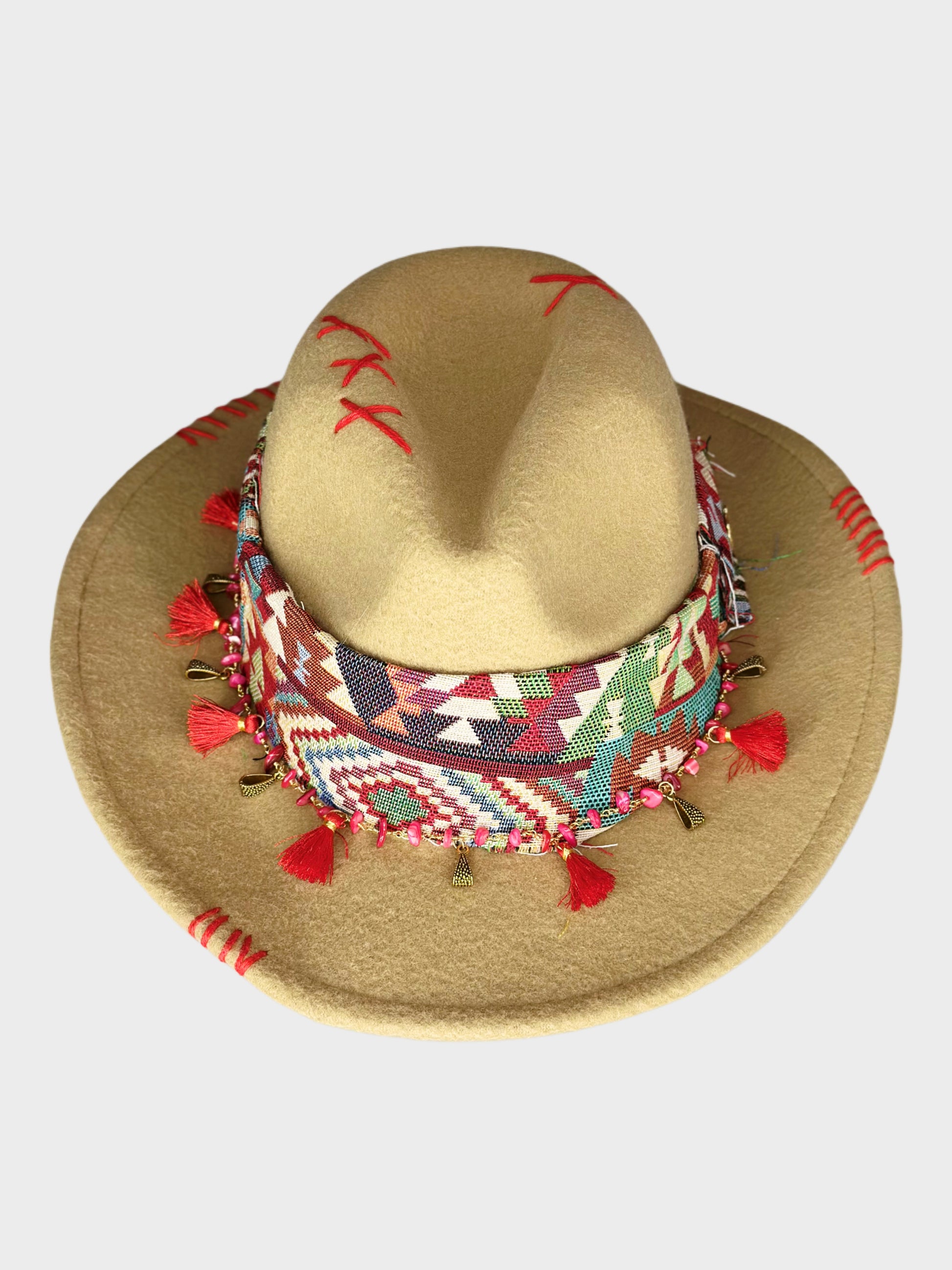 I dettagli in jacquard dai motivi etnici, le nappine e i charms in metallo aggiungono un tocco di vivacità e originalità al cappello, sottolineando il suo carattere unico dal look boho-chic. La tesa media è larga 7,5 cm., ideale per le giornate all'aperto.