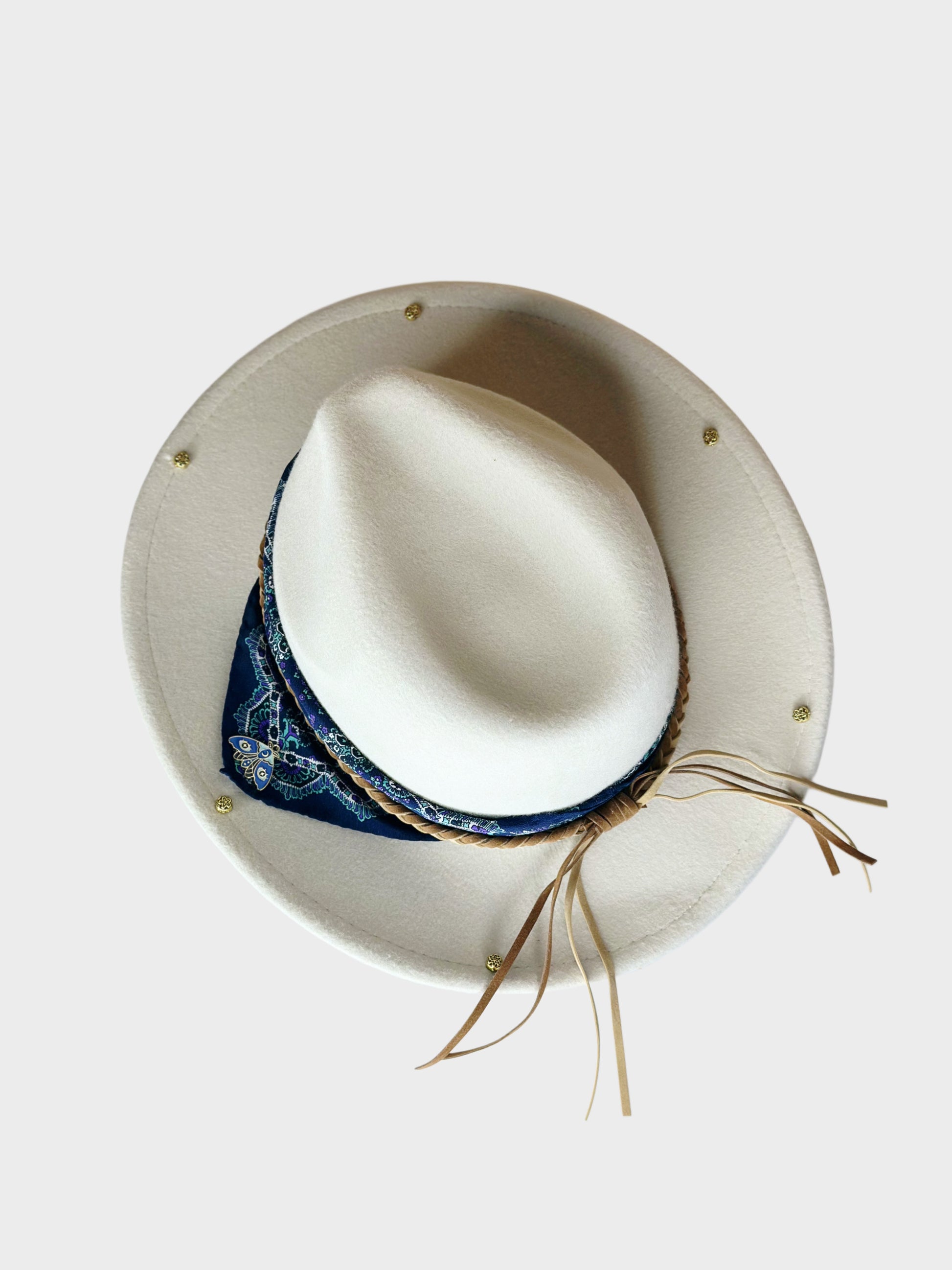 Fedora Hat, è uno dei modelli più classici dal design raffinato grazie alla linea minimalista. Il foulard in seta dai motivi etnici, il dettaglio intrecciati e i charms in metallo aggiungono un tocco di vivacità e originalità al cappello dal carattere unico dal look boho-chic. La tesa media è larga 7,5 cm., ideale per le giornate all'aperto.