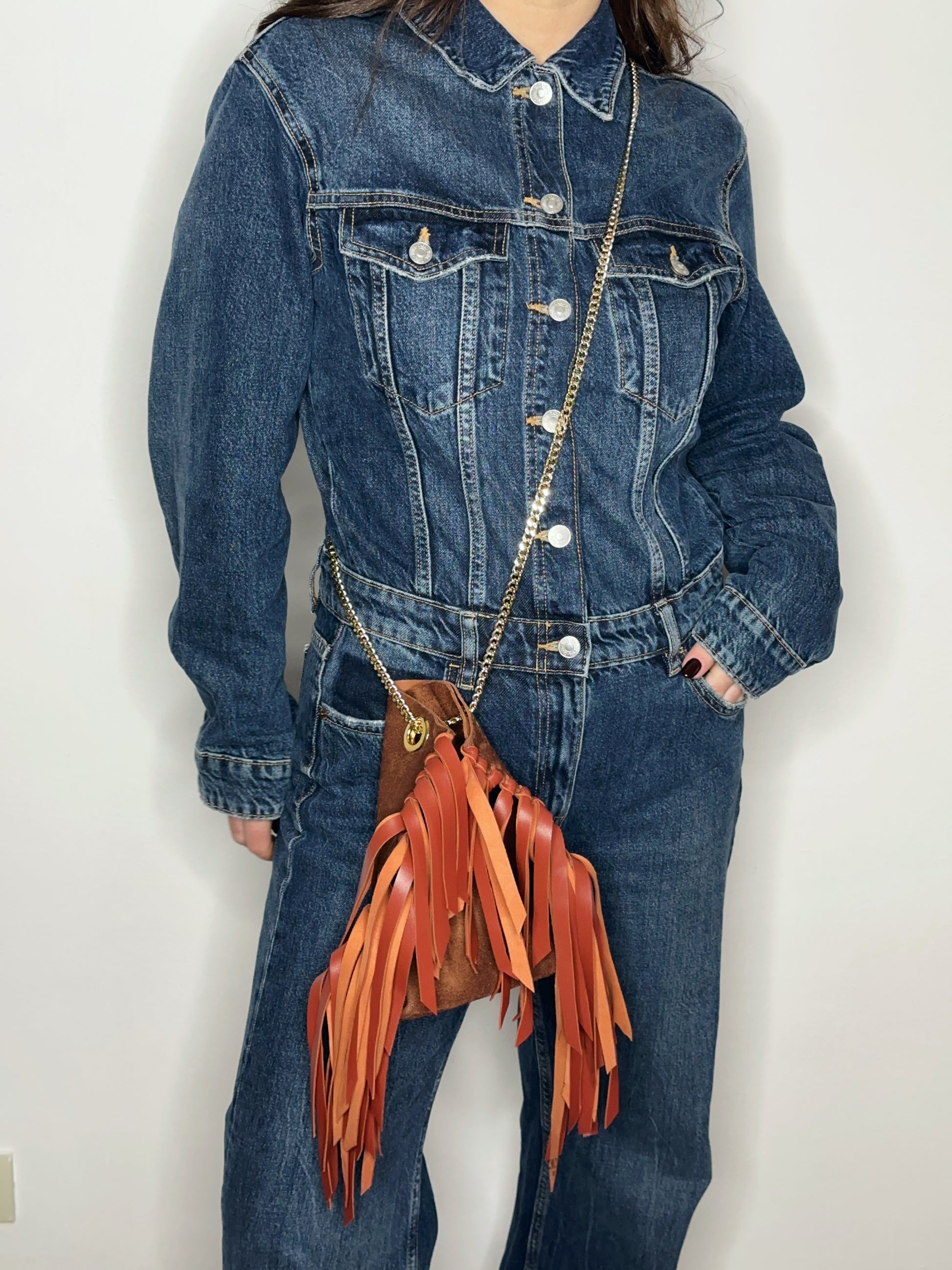 La Mini Tote Bag è impreziosita da lunghe frange laterali e da una tracolla in metallo che regala un punto luce al design minimalista. Borsa sfoderata dalle dimensioni midi e comoda da usare grazie alla catena regolabile attraverso i quattro occhielli che ci permettono di vestirla a spalla o a tracolla in base al nostro outfit. Ideata per adattarsi a uno stile di vita moderno.
