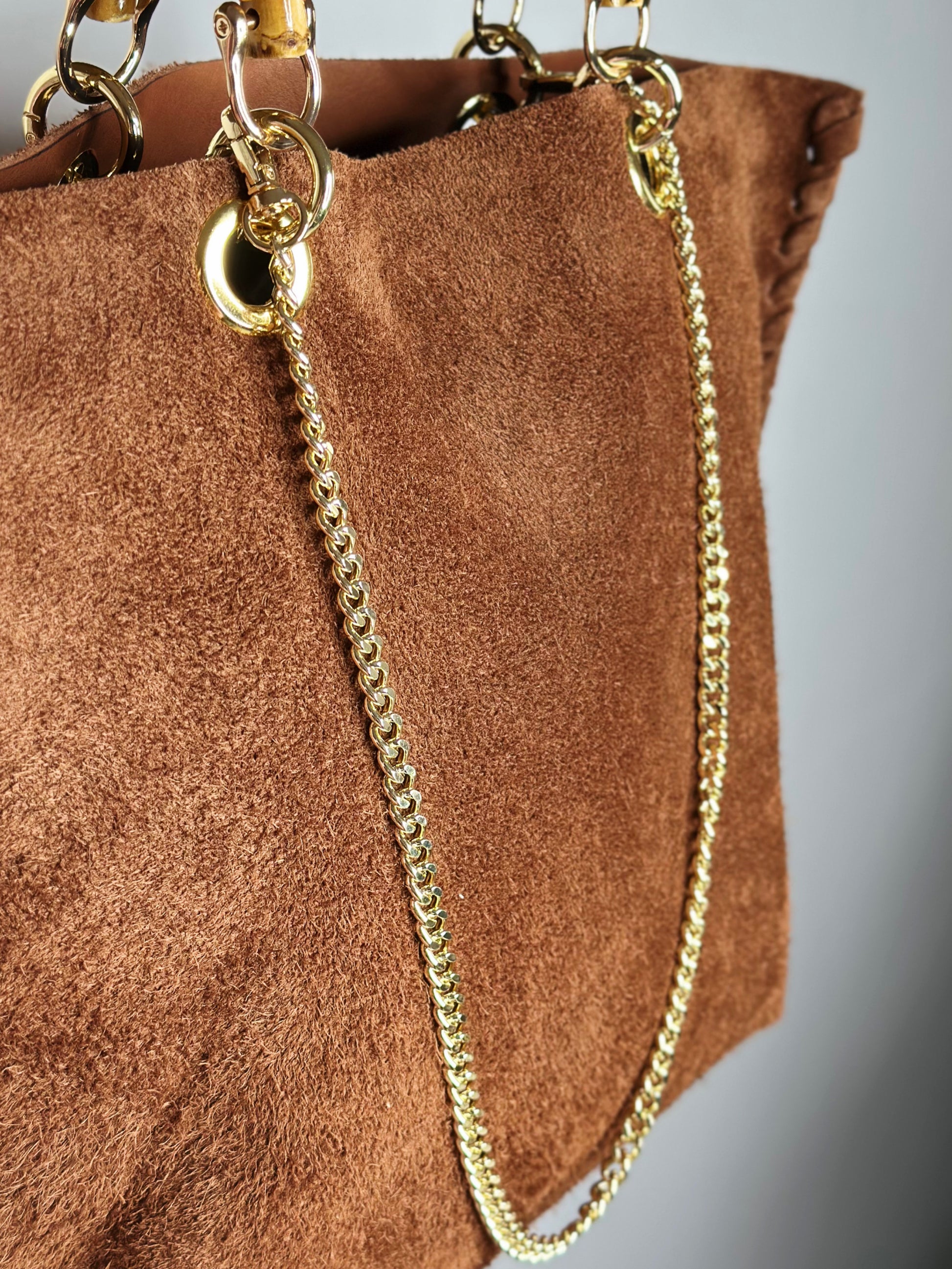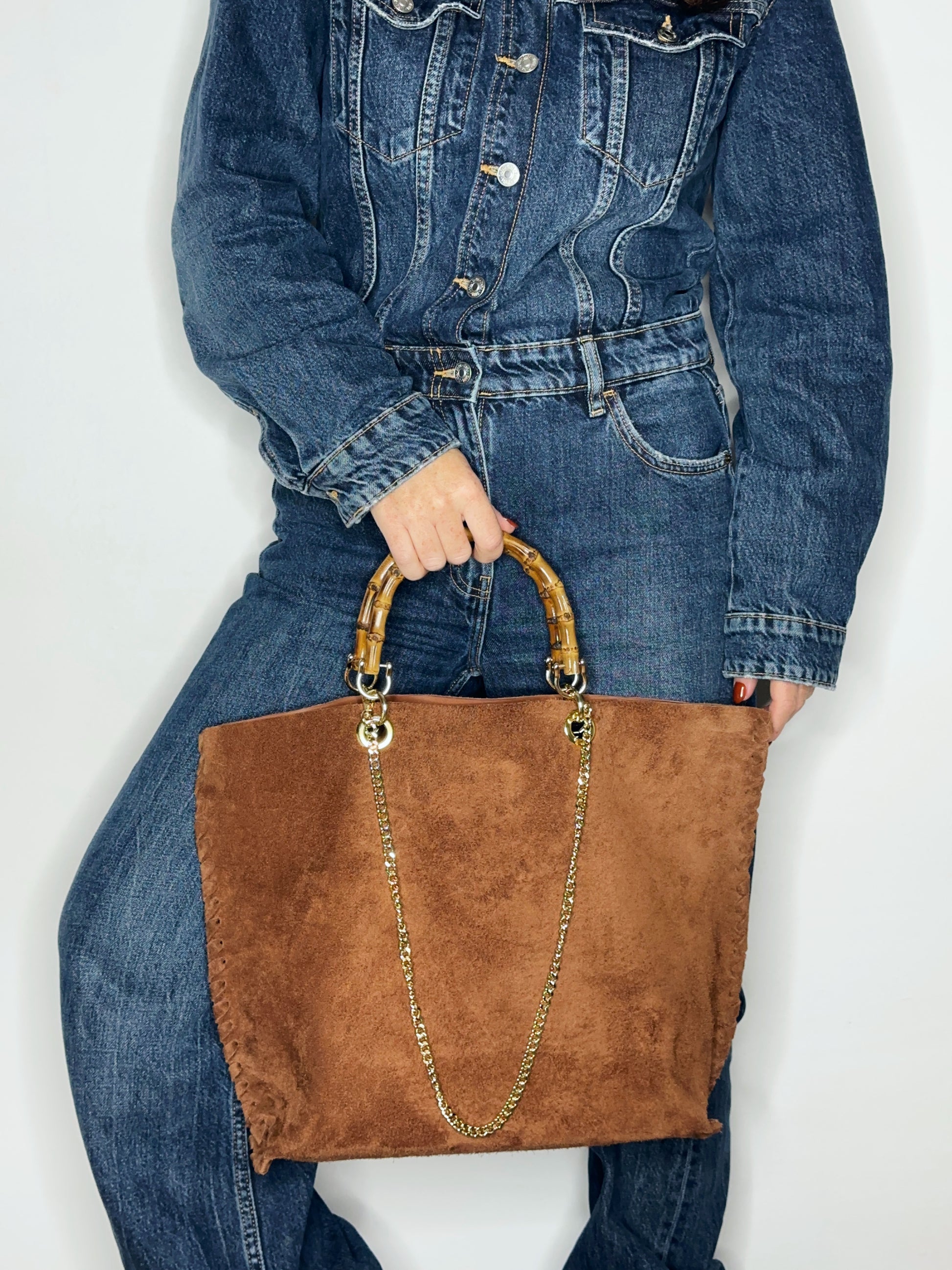 La Picnic Bag è la maxi tote bag di Ruj H. pensata per contenere tutto l’indispensabile per raggiungere la missione della giornata; perfetta per il lavoro, per i weekend fuori porta e le giornate all’aria aperta. Questa versione è realizzata in suede con gli interni sfoderati e provvista di catena per indossarla più comodamente a spalla. Con lei è impossibile dimenticarsi qualcosa, entra tutto!