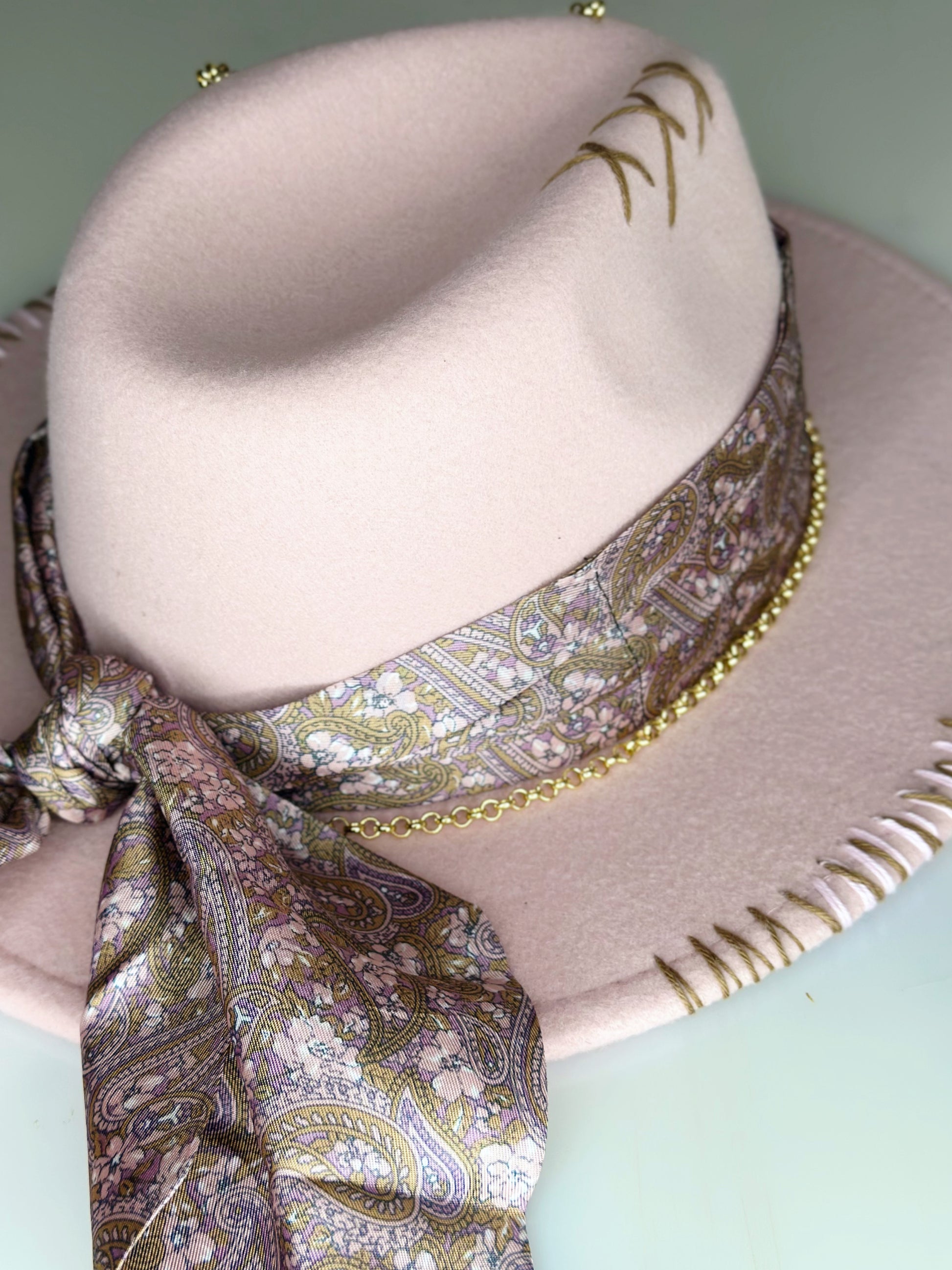 il foulard in setà dai motivi etnici, le nappine e i charms in metallo aggiungono un tocco di vivacità e originalità al cappello dal carattere unico dal look boho-chic. La tesa media è larga 7,5 cm., ideale per le giornate all'aperto.