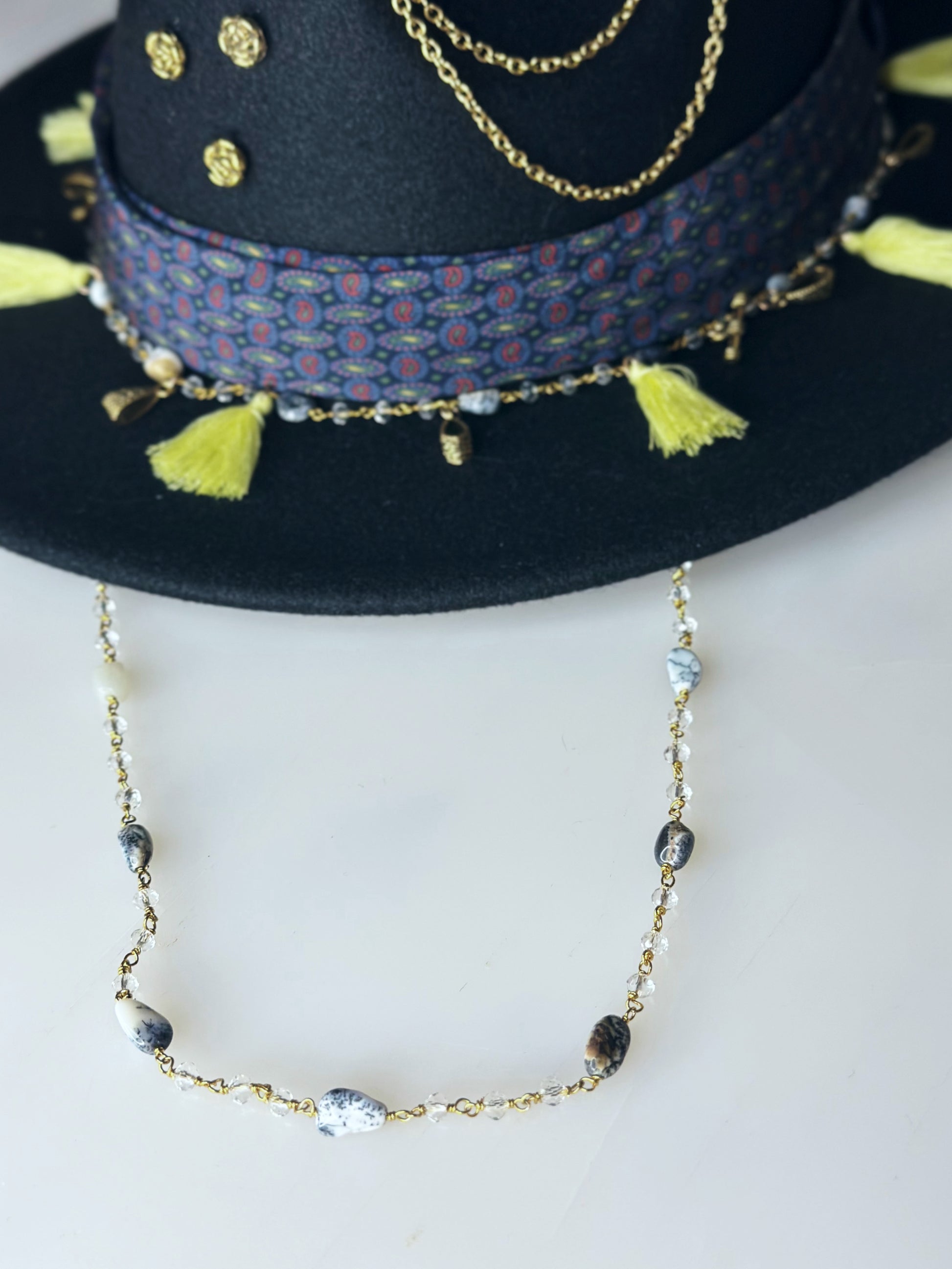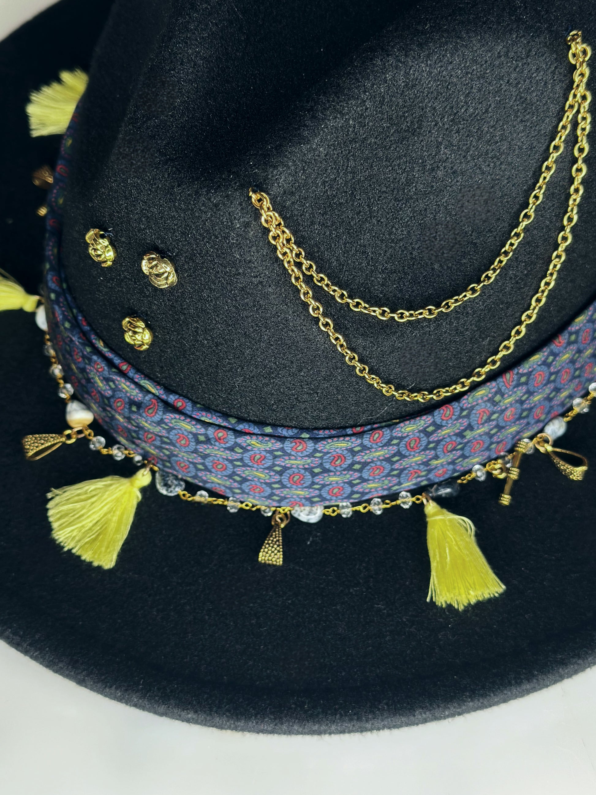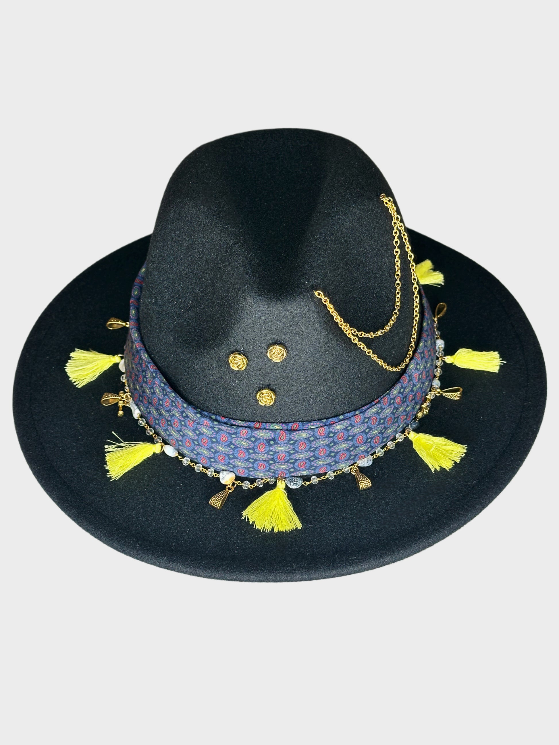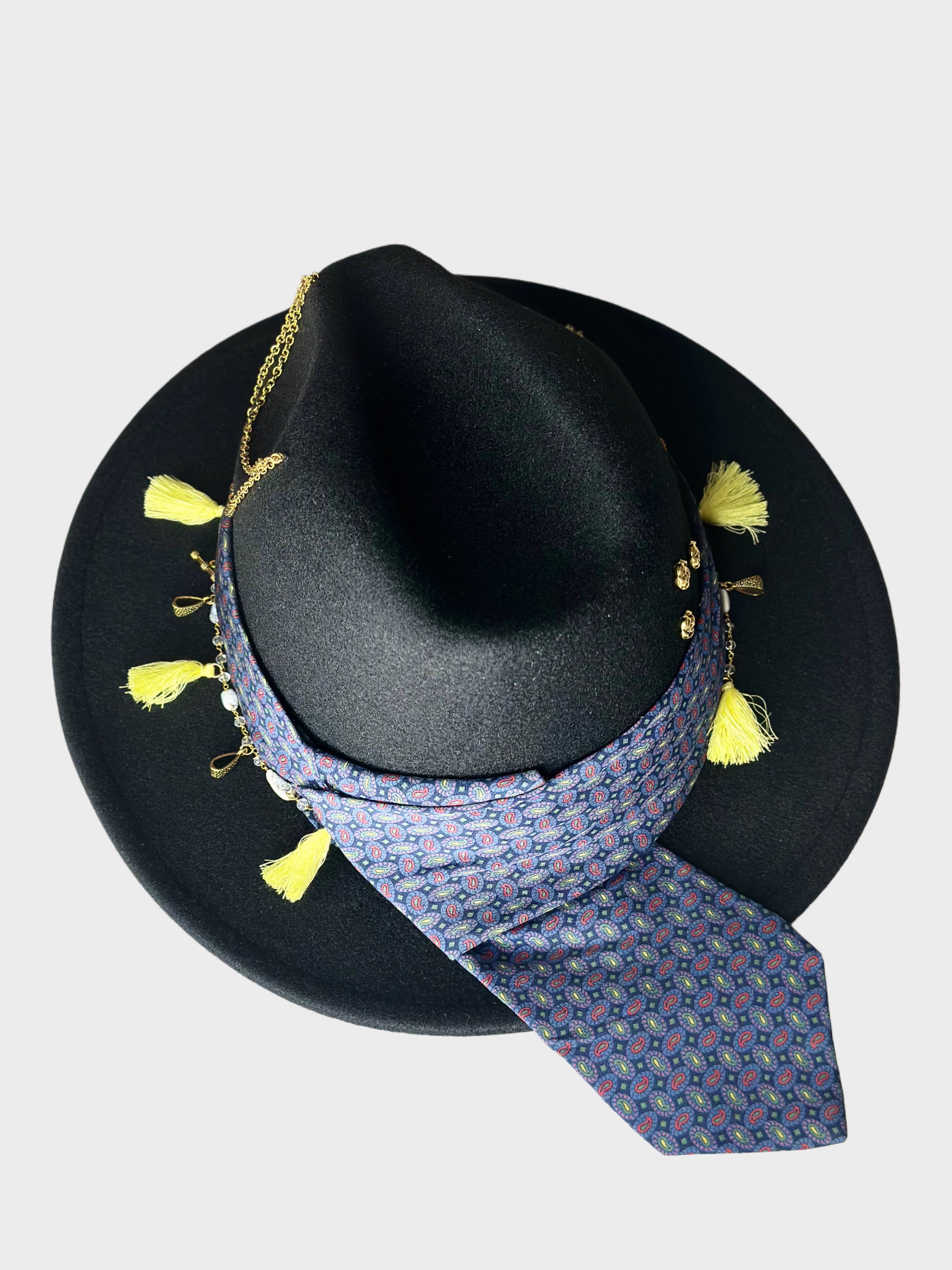 Fedora Hat, è uno dei modelli più classici dal design raffinato grazie alla linea minimalista. La cravatta vintage di seta, le nappine e i charms in metallo aggiungono un tocco di vivacità e originalità al cappello, sottolineando il suo carattere unico dal look boho-chic. La tesa media è larga 7,5 cm., ideale per le giornate all'aperto.