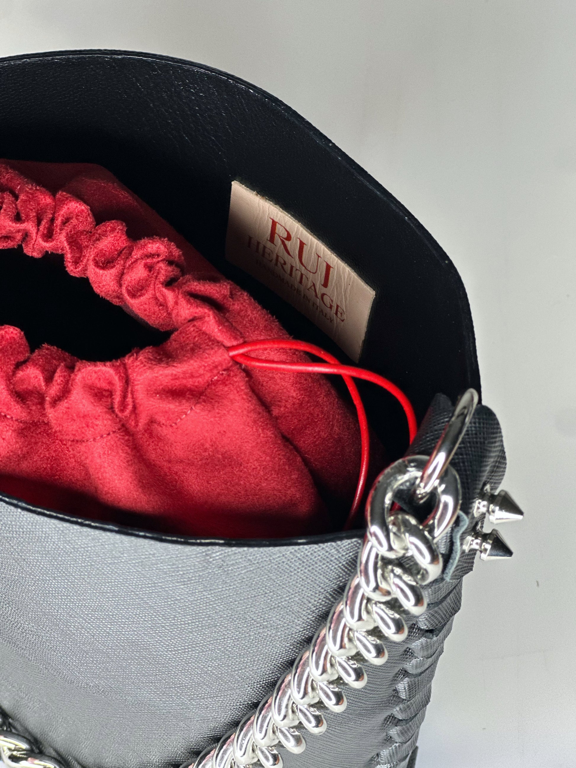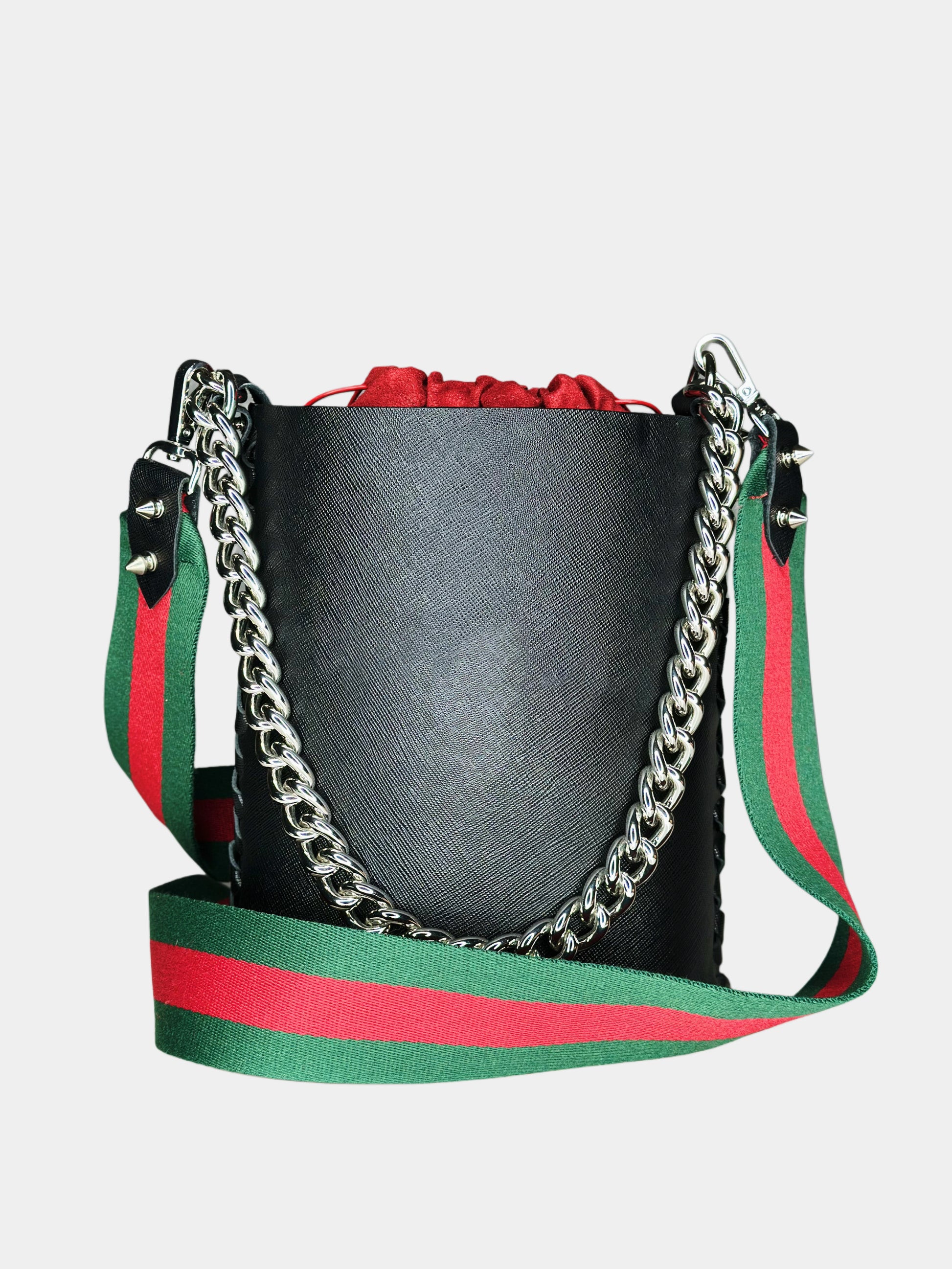 La Bucket Bag è nota per la forma cilindrica a secchiello che sostiene la borsa. Linea pulita e dimensioni mini ma capienti per gli interni foderati in capretto e provvisti di sacchettino in alcantara rosso con chiusura a coulisse, manico in catena e tracolla, per offrire la massima versatilità.